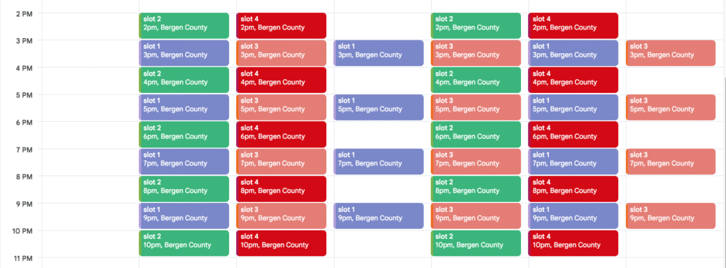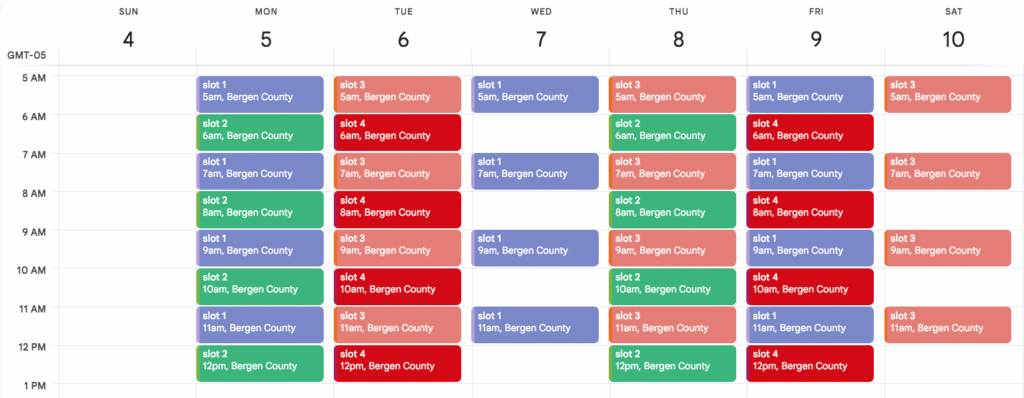 We have 18, 2-class-per-week slots and 16, 3-class-per-week slots—just like studio classes. Slot 1 and Slot 3 (blue and beige) meet three times per week (M-W-F or Tu-Th-Sat) at 5 am, 7 am, 9 am, … up to 9 pm. Slot 2 and Slot 4 (green and red) meet twice per week (M-Th or Tu-Fri) at 6 am, 8 am, 10 am, … up to 10 pm. (There are no classes from 1-2pm.) Please choose the class time-slot that fits your needs, and that you can commit to each week, and we will do our best to accommodate it. If your preferred slot (say Slot 1 at 7pm) is full, you may be placed on a waitlist or asked to select an alternate.