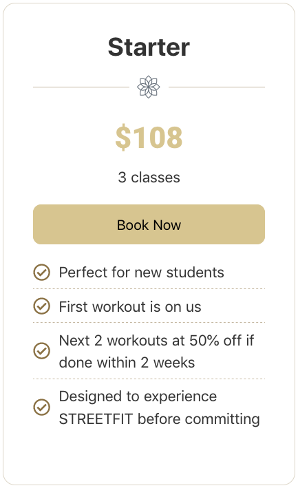 Enjoy a Free first workout to experience STREETFIT. Afterward, you can continue with the 2-Session Intro Pack at 50% off if used within 2 weeks — perfect to try STREETFIT without committing.