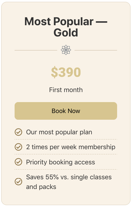 Lock in a 2×/week or 3×/week membership, billed every 4 weeks. Members enjoy preferred scheduling, priority booking, and a consistent weekly time slot, helping you stay on track and achieve better results. A Founders Discount of 50% off your first month is available for a limited time.